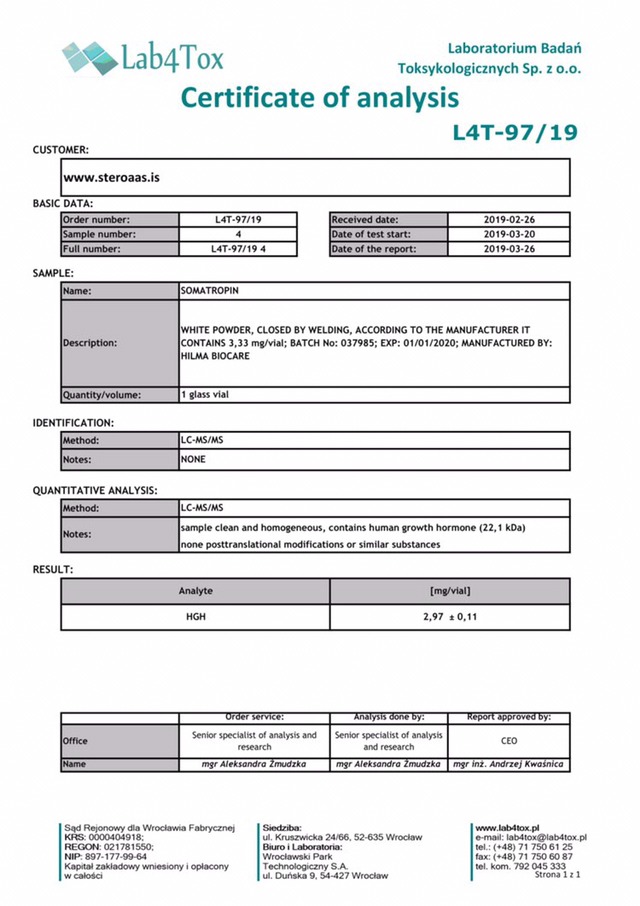 HGH Somatropin Hilma Biocare is a recombinant human growth hormone in liquid form, identical to the naturally produced pituitary growth hormone. It consists of a 191-amino acid polypeptide and is well-tolerated by both men and women. Human Growth Hormone (HGH) has been used for decades to treat weight and growth disorders and is highly effective in enhancing athletic performance. It plays a vital role in protein metabolism by stimulating amino acid transport into cells, boosting collagen synthesis, and increasing blood glucose levels. HGH also enhances the absorption of essential nutrients like nitrogen, phosphorus, calcium, and sodium.